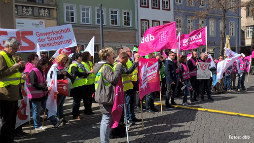 Die erste Runde der Tarifverhandlungen über Einkommen und Arbeitsbedingungen der Beschäftigten von Bund und Kommunen ist am 21. März 2016 ergebnislos vertagt worden. Um ihre Forderungen vor der nächsten Runde zu untermauern, sind Bundes- und Kommunalbeschäftigte in Erfurt am 6. April 2016 auf die Straße gegangen. Die Teilnehmer, darunter Kolleginnen und Kollegen der Stadtverwaltung, der Bundesagentur für Arbeit sowie Mitglieder der Jugend machten auf Transparenten und in Sprechchören auf dem Fischmarkt vor dem Rathaus deutlich, dass sie Verhandlungsergebnisse statt Hinhaltetaktiken erwarten.