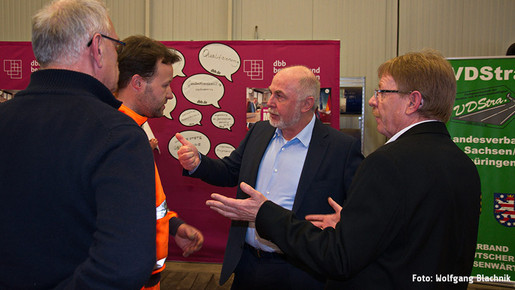 - dbb Bundesvorsitzender Ulrich Silberbach (2.v.r) diskutiert zusammen mit dem Bundesvorsitzenden der Fachgewerkschaft VDStra., Hermann-Josef Siebigteroth (r.), und zwei Straßenwärtern.