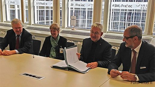 v.l.n.r.: Harald Olschok - Hauptgeschäftsführer BDSW, Claudia Uhe - Geschäftsführerin FraSec, Willi Russ - Zweiter Vorsitzender des dbb/dbb Fachvorstand Tarifpolitik und Rainer Friebertshäuser - Geschäftsführer und Arbeitsdirektor FraSec