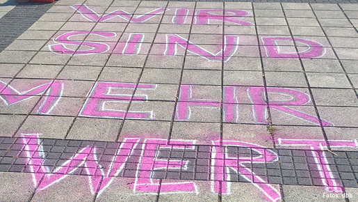 Am Donnerstag, 15. September 2016, haben sich die Beschäftigten zu einer kreativen Protestaktion auf dem Naunhofer Marktplatz versammelt: Sie malten ihre Forderungen mit bunter Kreide großflächig auf den Platz. „Unsere Botschaft scheint ja immer noch nicht überall angekommen zu sein. Deshalb platzieren wir sie nochmal etwas prominenter“, kommentierte Willi Russ.