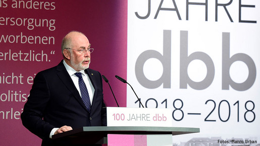 Vor 100 Jahren wurde der Deutsche Beamtenbund gegründet. Beim Festakt am 29. November 2018 mit Bundespräsident Frank-Walter Steinmeier hat der dbb Bundesvorsitzende Ulrich Silberbach die Beschäftigten des öffentlichen Dienstes zur Verteidigung der Demokratie aufgerufen.